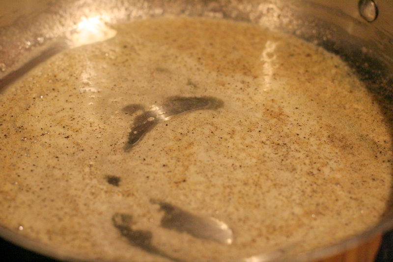 Set a 12″ skillet over medium-high heat (the book says to do this 15 minutes before you’re ready to serve and eat, so set the table and get the rice ready). Melt 2 tablespoons of butter with a little salt and pepper.