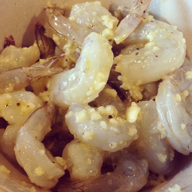Combine the olive oil, lemon juice, garlic, salt, pepper, and shrimp in a bowl.