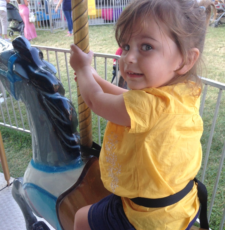 I took H on the carousel. She cannot be in the vicinity of a carousel without riding it. This was the only ride we did; I’m glad she’s still young enough for us to get away with that at a fair.