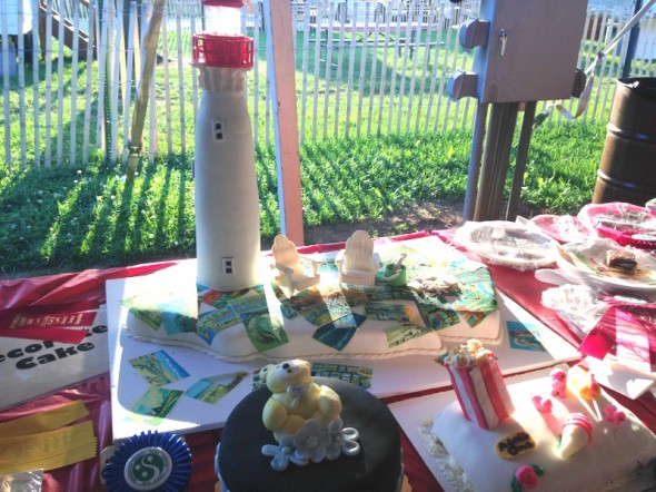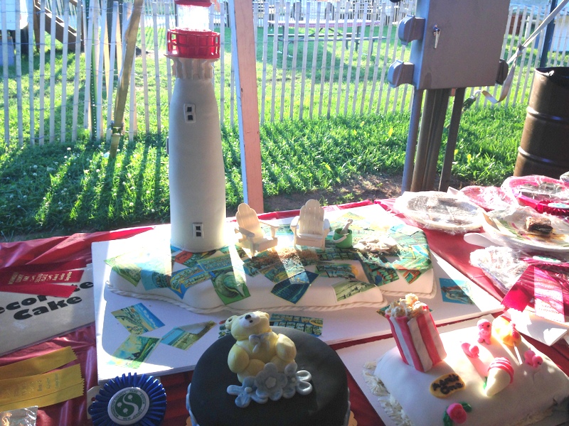 H and Adam watched the horses (which she adores, this was the first time Adam saw her reaction to horses), and I checked out the Home and Garden tent. All the competitions were there, including the cake decorating contest. These were some of the ribbon winners, I can’t get over that lighthouse cake.