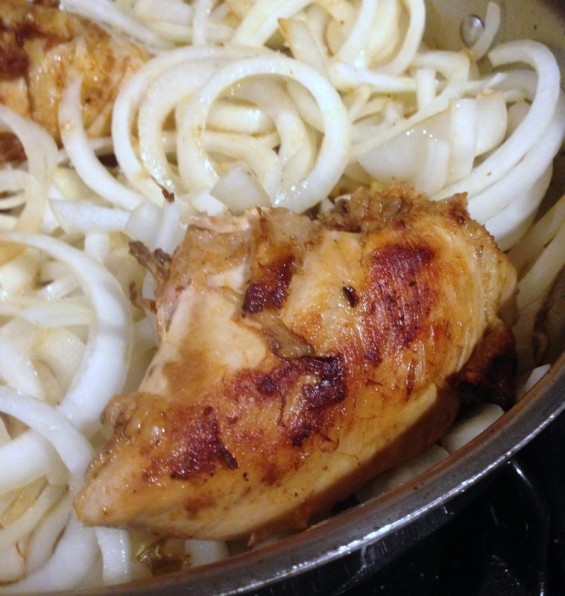 When I made this weeks ago I was too busy eating it to actually take a picture of the finished product, but you can see from the above photo that the chicken was slathered in amazingly good goodness. This was another summer recipe from The Splendid Table’s How to Eat Supper. I made 2 breasts instead of 6, but I only halved the rest of the recipe. A third of a third was just more than I could calculate while hungry (which I almost always am when cooking). Hungry math is just bad math.