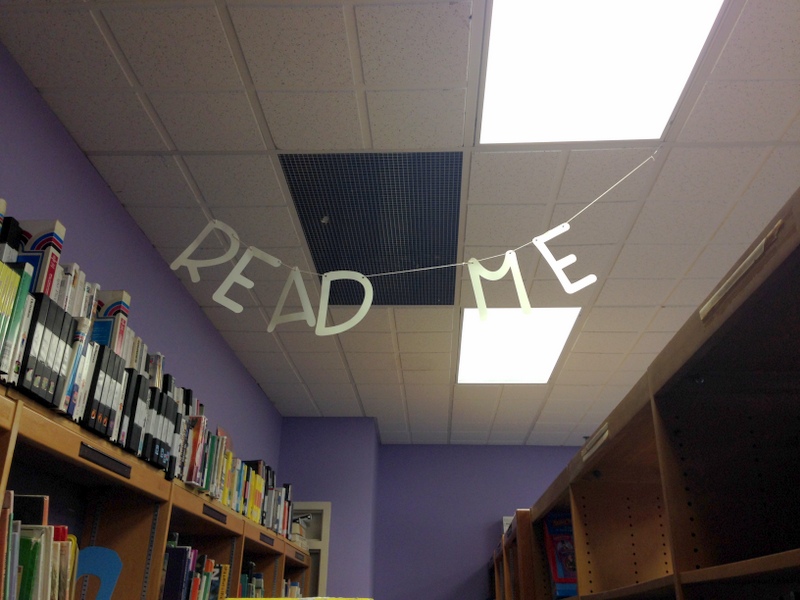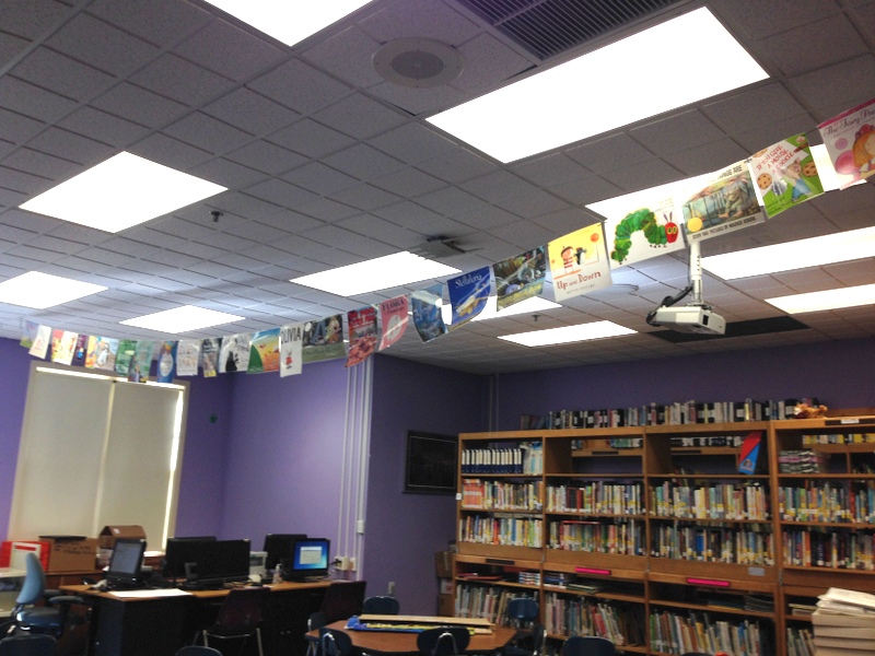 I kind of stole all of the dust covers off of H’s books (she just tears them anyway), cut them, and laminated them to make this banner. It stretches the width of the library, and it was slightly terrifying to hang. Surprisingly heavy to stretch across a ladder up at the ceiling. But, I love it and so do the kids.