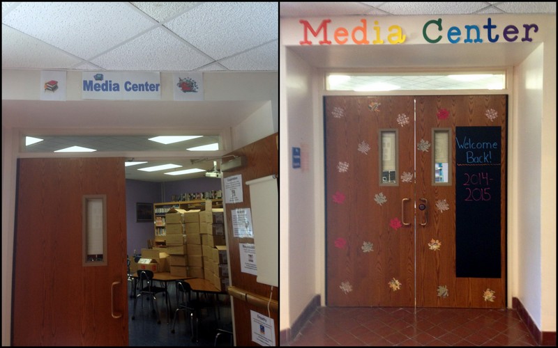And then there’s the door. I replaced the Media Center sign with some more Cricut letters (seriously, I’d be lost without that Cricut). I also used it to make some fall leaves. And I bought a chalkboard decal for the door, which will be really handy for announcements.