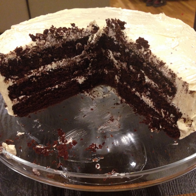 Adam’s birthday was a couple of weeks ago, and H was a huge help making his birthday cake. Every year I make a roast chicken dinner for him and bake a three-tiered devil’s food cake with vanilla buttercream. This year H helped with the cake. Baking with her always requires a little project management, but baking a three-tiered cake required a little more.