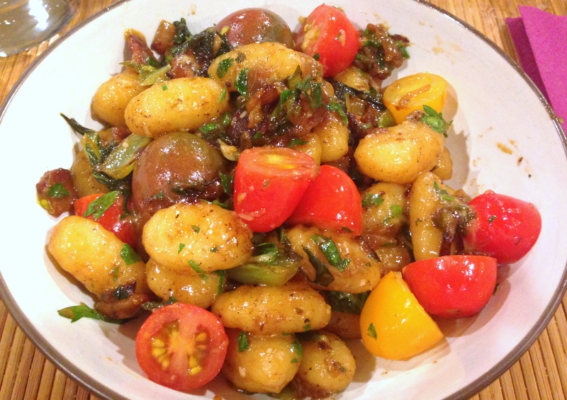 Meanwhile, bring a large pot of salted water to a boil and cook the gnocchi according to the directions. Reserve 1/2 cup cooking water, then drain the gnocchi and add to the pot with the escarole mixture. Add the reserved cooking water and stir to coat (1 minute). Stir in the tomatoes, parmesan and parsley; season with salt and pepper. Eat and enjoy.