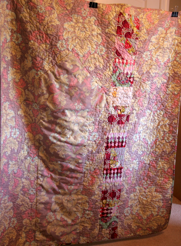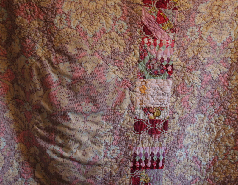 I so wish I’d taken better photos of this finished quilt, especially since I’ve been holding on to it since February 2013–which is when I finished it! My friend Kathy and I have birthdays two weeks apart, and that’s what this was originally for last February. I’ve seen her a couple of times since then, but we’ve either held off on exchanging presents or I’ve forgotten it completely. This is a testament to the kind of close friendships you can have in your thirties…you might not see each other as much as you see your friends in your 20s (we keep the love alive with snarky texts and Facebook comments), but you can deliver a gift almost two years late and still get hugs and love for it. We always pick up where we left off in the conversation.