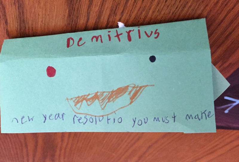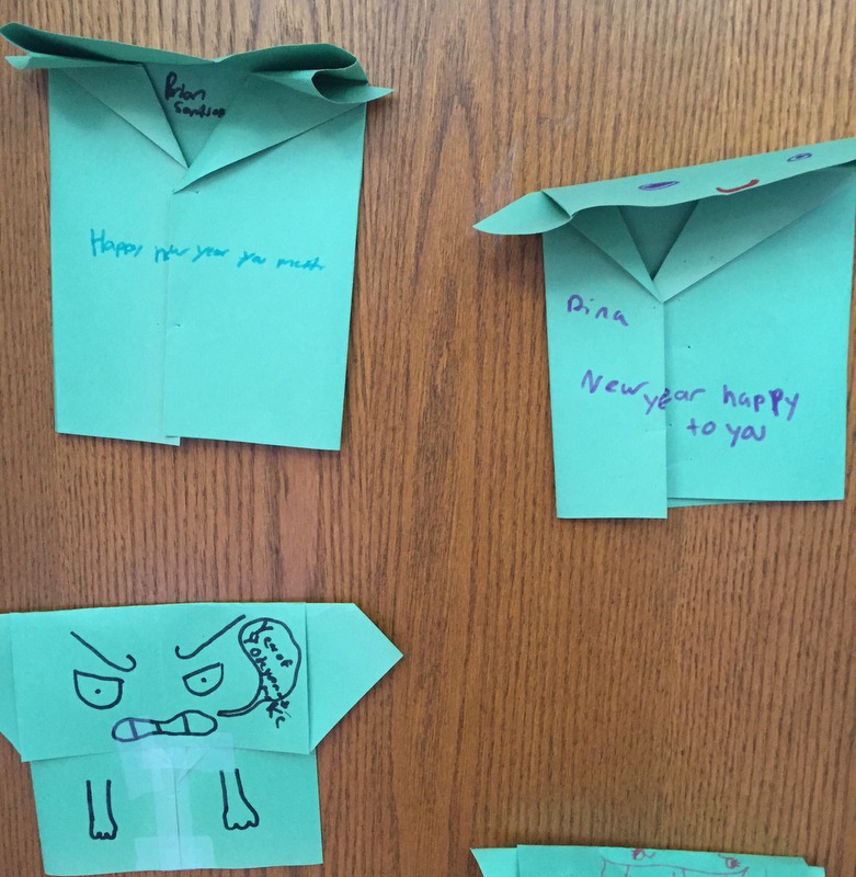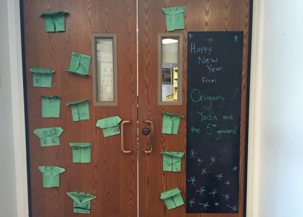 I’m reading The Strange Case of Origami Yoda with the 5th graders, and before the holiday break we learned how to make origami Yodas. I asked the students to write a New Year message in Yoda speak on their puppets so I could hang them up for January.