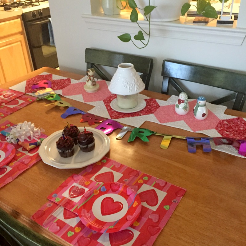 For my 36th, my extended family gathered last weekend for lunch…and a trip to see Spongebob Squarepants: Sponge Out of Water (if you see this movie prepare yourself, it is extremely trippy). The day after my birthday, my mom put out Valentine’s plates (which she has always done for my birthday), the traditional birthday banner, and cake. There is a mom trick I have yet to learn from her, which is always, always have birthday candles on hand no matter how old your kids are.