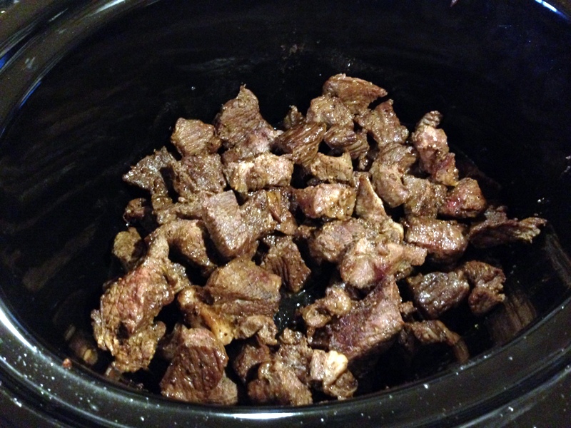 Heat a large skillet over medium-high. Pat the beef dry, then cook until browned on all sides, 8 to 10 minutes. Transfer to a slow cooker.