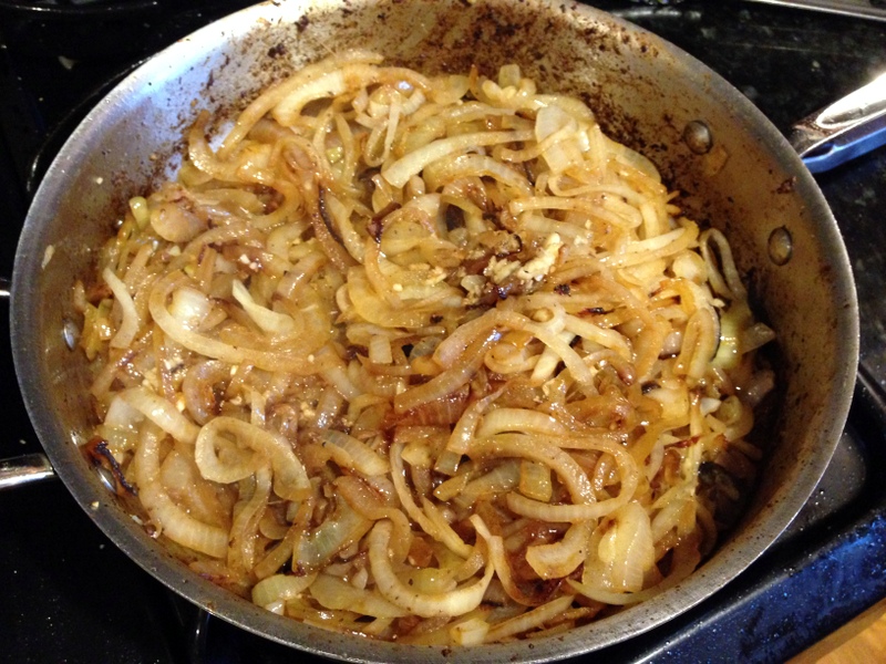 Add the onions to the hot skillet and cook 2 minutes without disturbing. Add the butter and garlic. Season and cook, turning occasionally, until the onions are softened, 10 minutes.