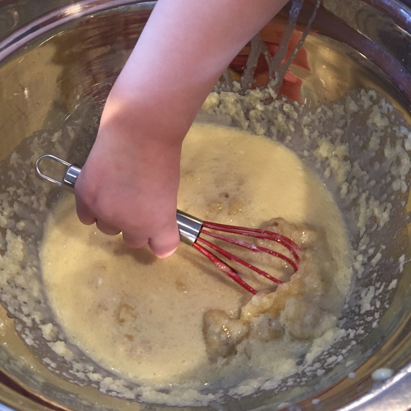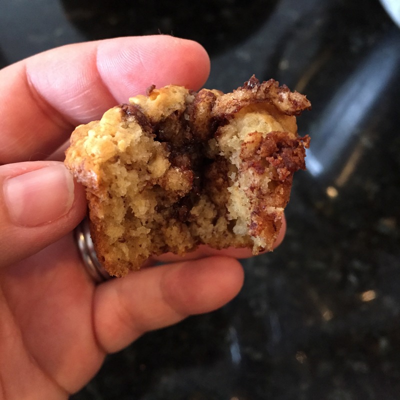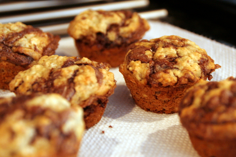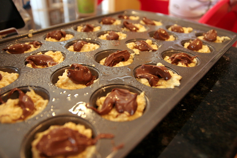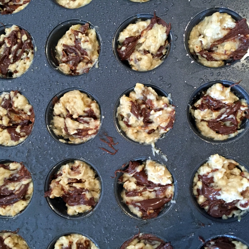 This recipe, from Chef-in-training, makes 12 regular muffins, or in our case 48 minis. Also, the original recipe calls for oil instead of butter, and when it comes to baking I am firmly #teambutter. So I substituted an equal amount of melted butter, and they were grand. Swirling the Nutella into them was the most time consuming part, but so very worth it.