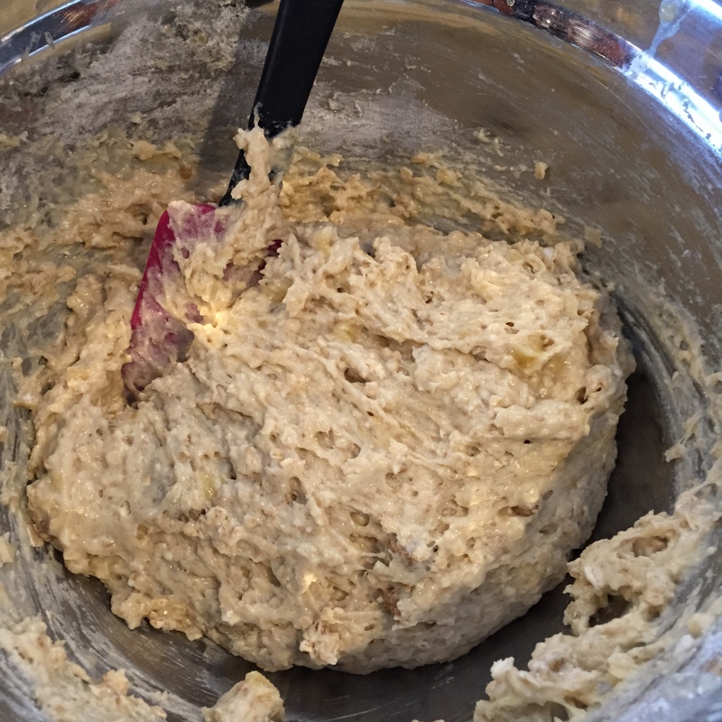 Add flour mixture to the banana mixture and stir until ingredients are just incorporated.