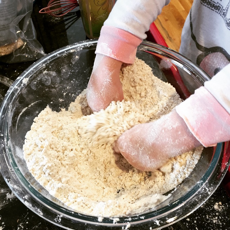 Combine flour, oats, white sugar, brown sugar, baking powder, baking soda and salt in a medium bowl. Stir until ingredients are well combined, preferably using small hands as mixers.