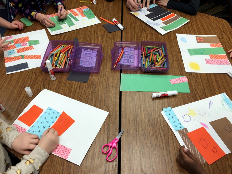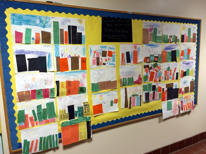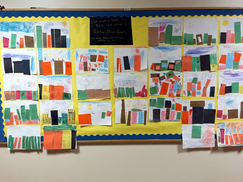 When we finished the unit completely, after talking about how Keats makes his illustrations (a combination of paint and collage), we made our own cityscapes using cut paper and crayons (I don’t have any paint). I thought the kids did a great job with this. It was great practice with the scissors, and they really tried to keep their buildings on the bottom half of their papers. I used whatever construction paper I currently have (not much) and some scrapbook paper I’d brought to school.