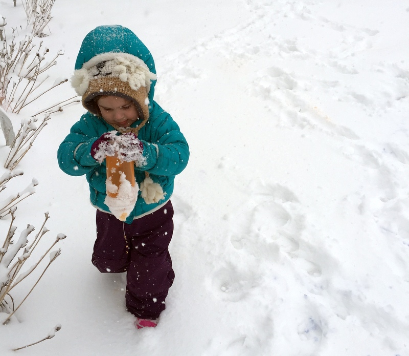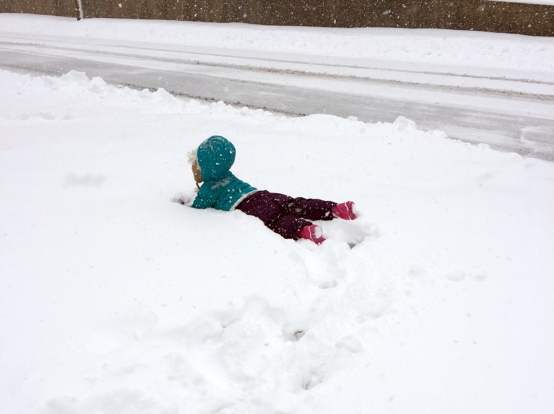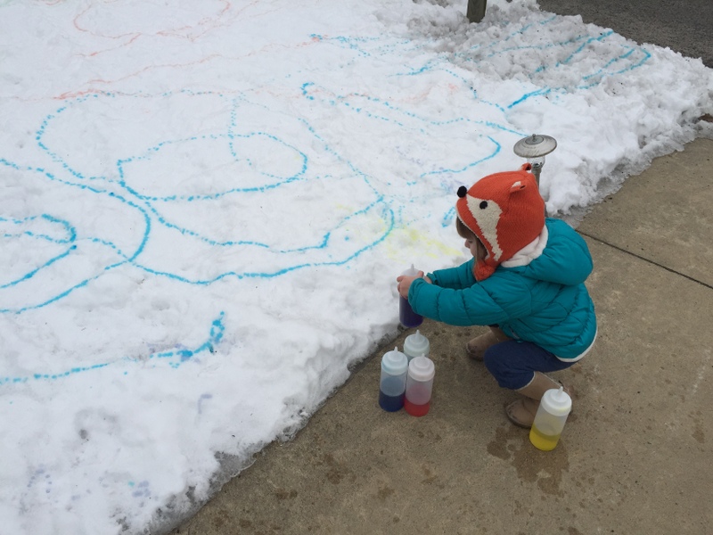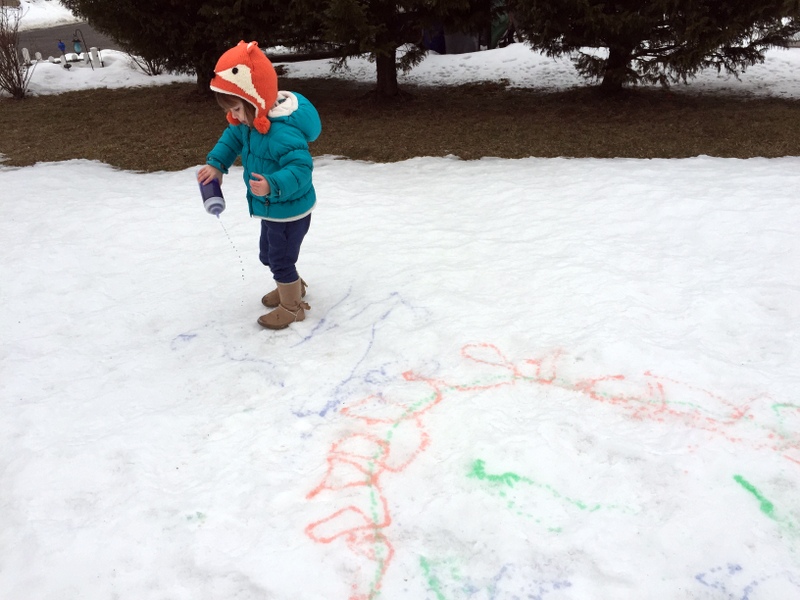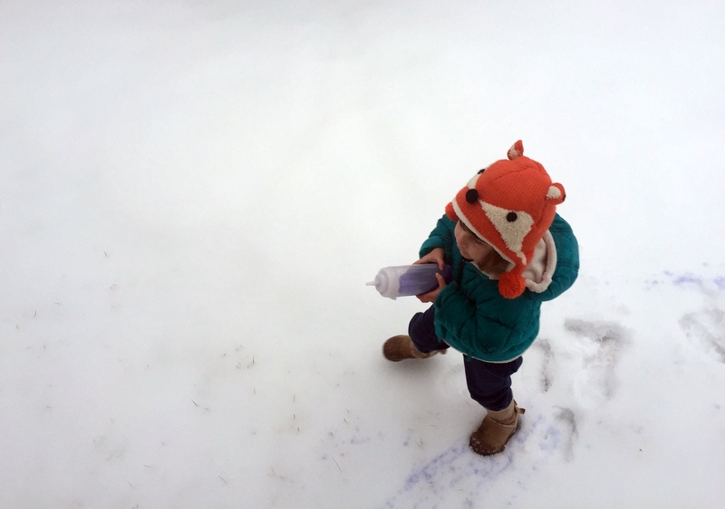 Last week was an absolute BEAR. I came home Monday from work and got sick, and I stayed sick through Friday night. In between bouts of thinking I was better before getting sick again, we had a blizzard. And H and I played in the snow. AND, for the umpteenth time this winter, we snow painted. Which was so incredibly good for my soul.