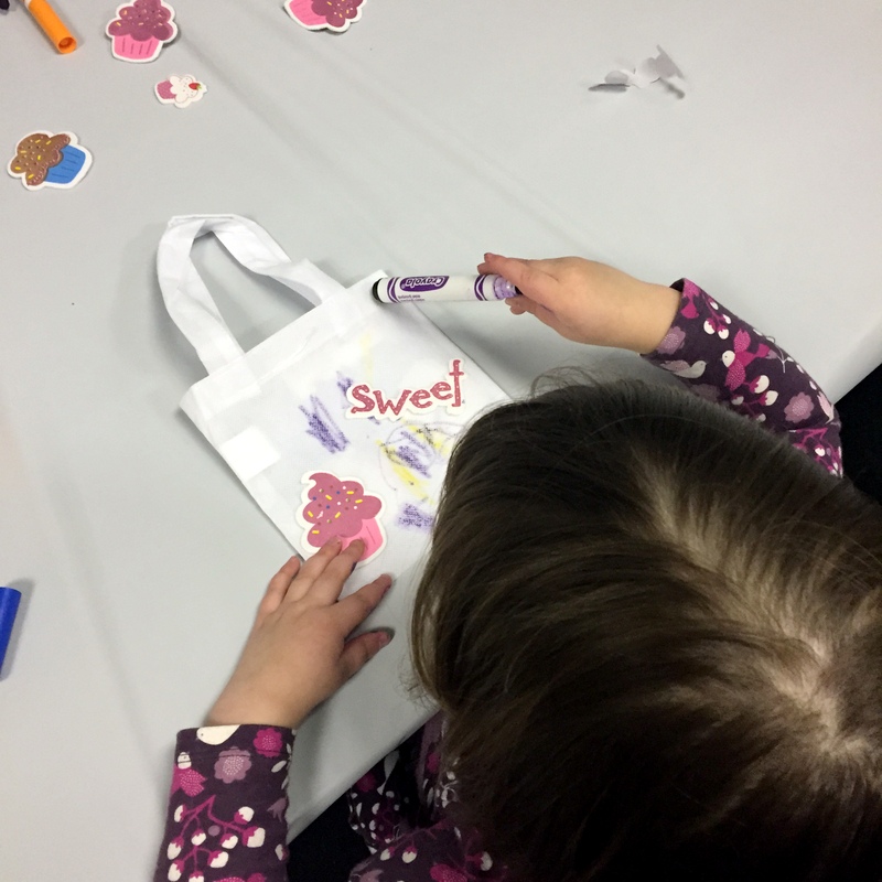 Everyone decorated a little bag. They had candy favors and ate pizza. And our party host kept the music playing and the kids dancing and clapping.