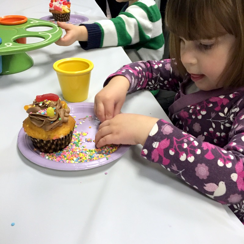 Decorating their own cupcakes was the big, main event. H very seriously emptied all of the sprinkles onto her plate so she could work on her cupcake.