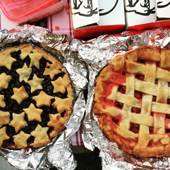 I made patriotic desserts for a party at my brother and sister-in-law’s pool club. Blueberry pie (which was honestly terrible) and sour cherry pie (which was glorious).