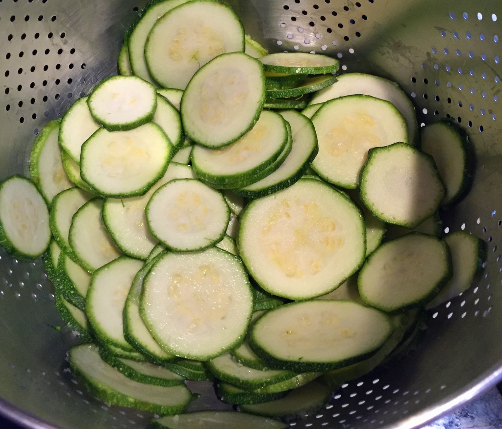 1-1/2 lbs zucchini, sliced into 1/8″ thick pieces (peels on, and I used a mandolin)