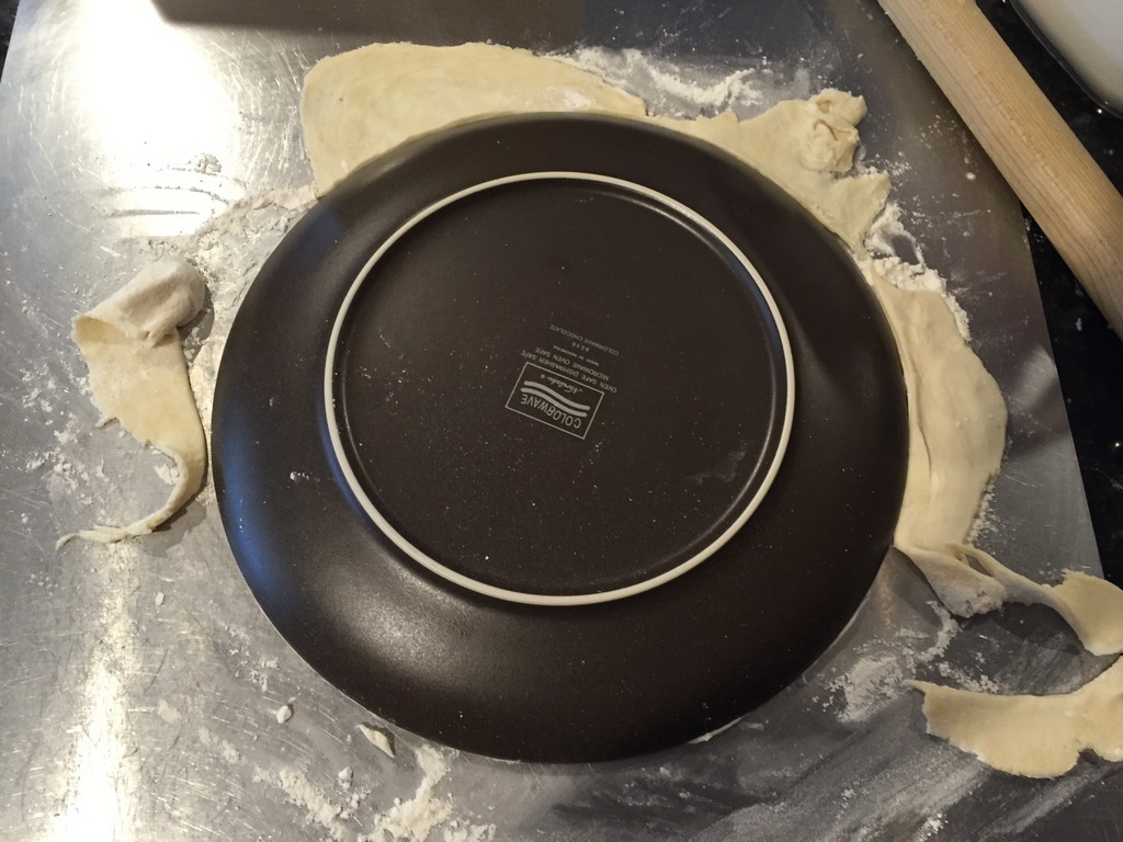 Preheat the oven to 400 and roll the dough out onto a floured surface until it’s an 11″ circle. I used one of my serving plates to size this.