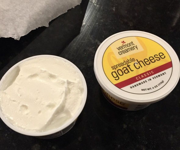 With a fork, mash together the goat cheese, thyme, lemon zest, 1/2 tsp salt, and 1/4 tsp pepper. Set aside. I didn’t photograph this, but here’s the awesome goat cheese I used.