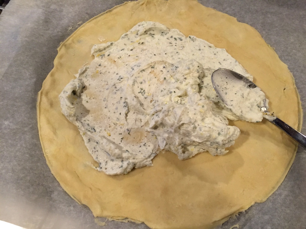 Move the dough disk to a sheet pan lined with parchment. Spread the goat cheese mixture all over, like you’re saucing a pizza, leaving a 1/2″ border.
