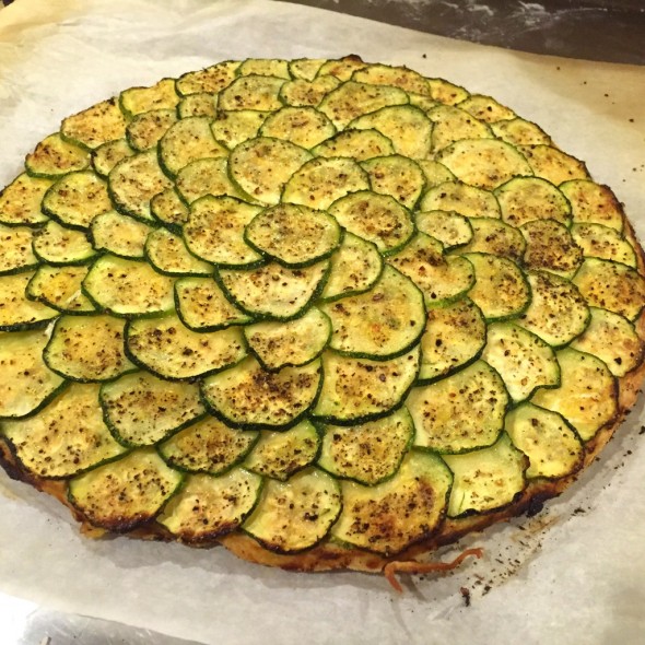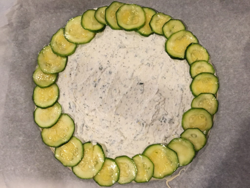 Lay the zucchini slices in “tightly overlapping circles,” starting at the very edge of the pastry. It will shrink in a little as it bakes.