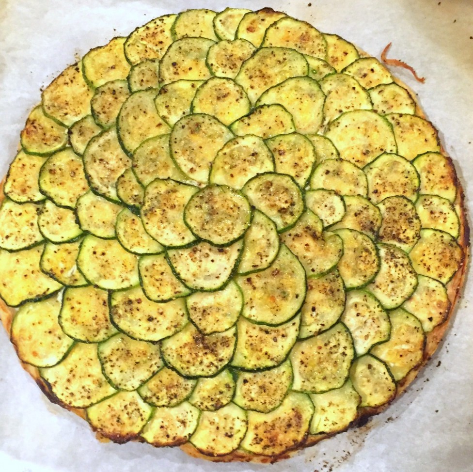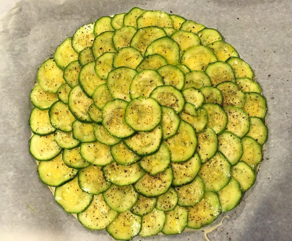 Continue the overlapping zucchini circles until the entire tart is covered. Drizzle with the last 1 Tbsp olive oil and sprinkle with pepper.
