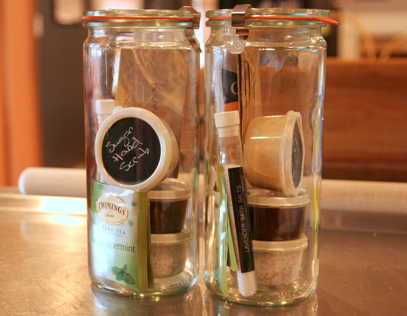 I wanted to give something to the ladies at the desk, too, so I used The Gunny Sack’s spa recipes to fill Weck jars with good stuff. Foot soak, hand scrub, sugar scrub, tea, Starbucks cards.