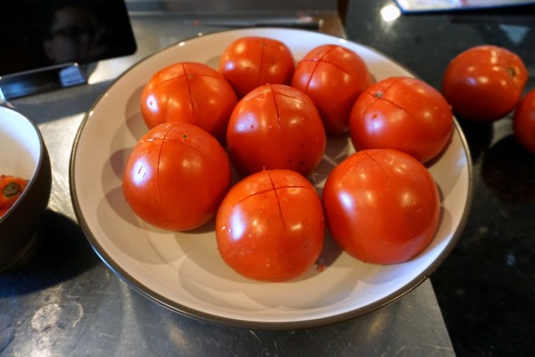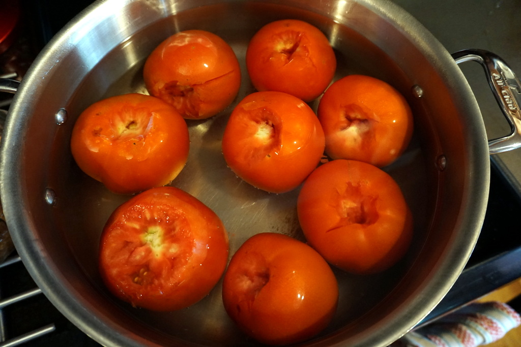 Pour boiling water over tomatoes; let sit until skin is easily peeled, about 15 seconds. Drain tomatoes, and cover with ice. **Now, I didn’t get all of my peels off this way, so I did end up submerging mine in boiling water for a bit. Once they get going, the peeling is easy.