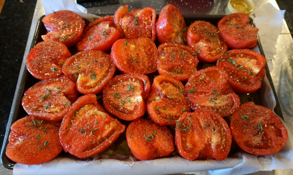 And I’m pretty sure this was the last new thing I made before the school year snowed me under a bit. I made tomato confit with the very last of the fresh Jersey tomatoes I found at a local produce stand. Confit is, essentially, slow-cooking something in fat. I used olive oil.