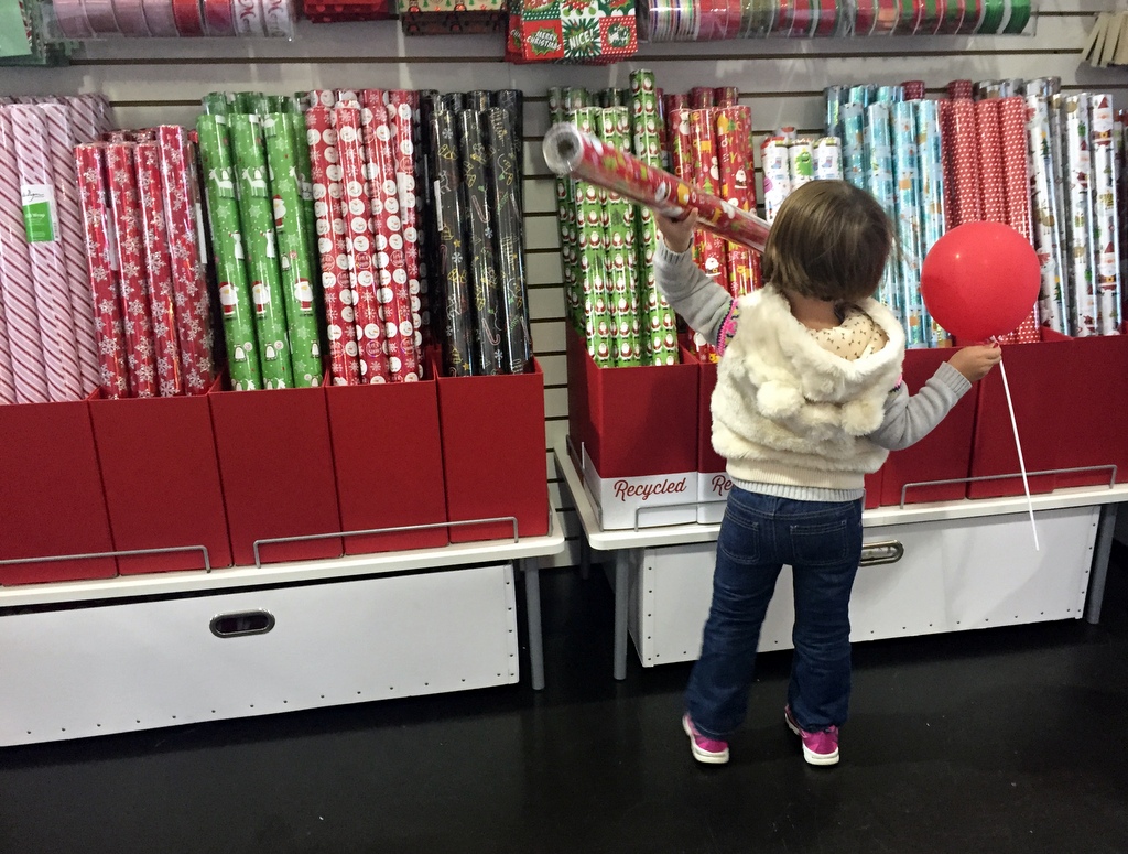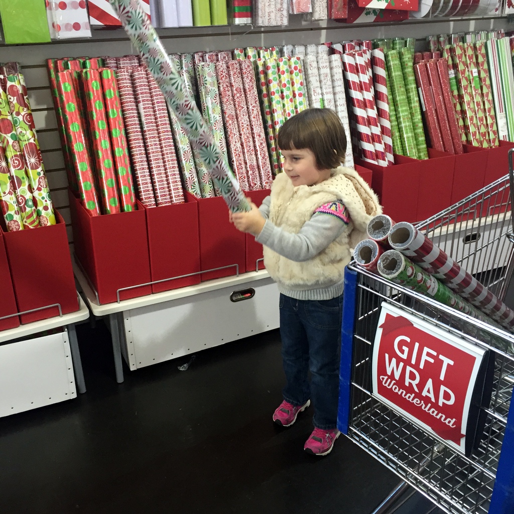H and I hit up The Container Store in Paramus last Friday, the same day as coffee with Kathy, for one of my favorite annual holiday traditions. I actually debated whether we should make the hour drive this year just for wrapping paper, when I’d seen some cute prints at our local TJ Maxx. But tradition is tradition is tradition. It makes me happy to watch H get in on these rituals.