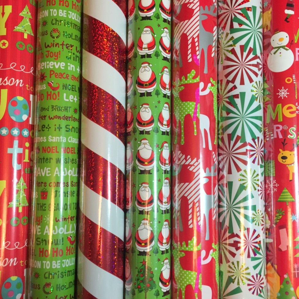I would show her rolls that I like, like this one black roll that looked like a chalkboard with writing. She shot me right down with a “No, thank you!” For more than one of my own picks. She went straight for red and bright green this year, and she went for sparkle. I can’t argue with that. She has a solid history of picking our holiday paper.
