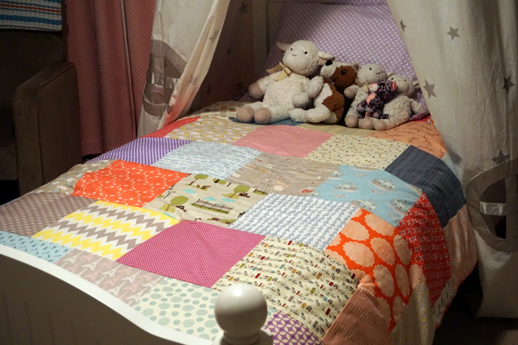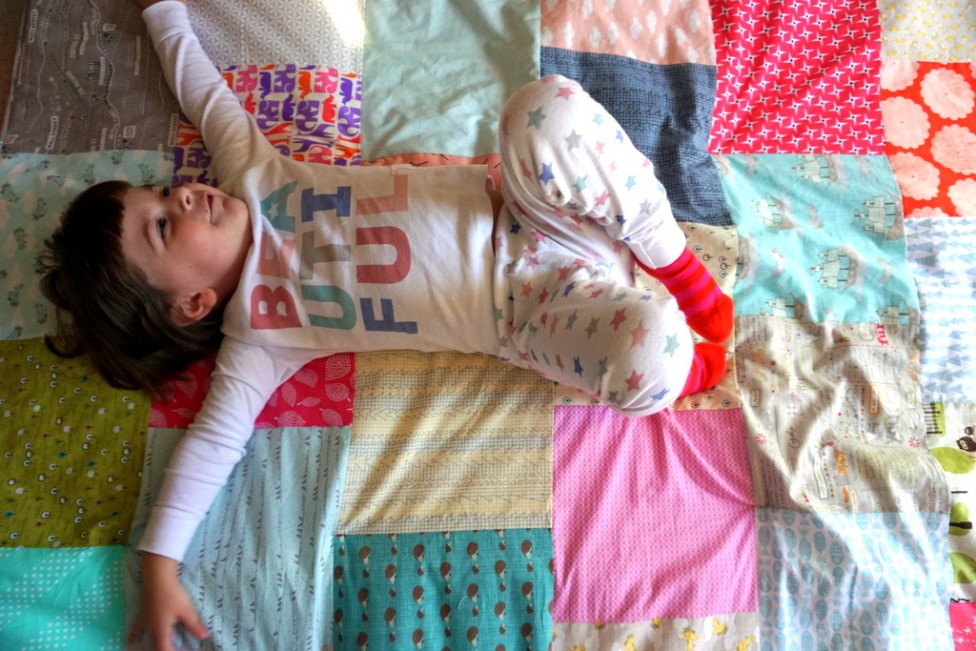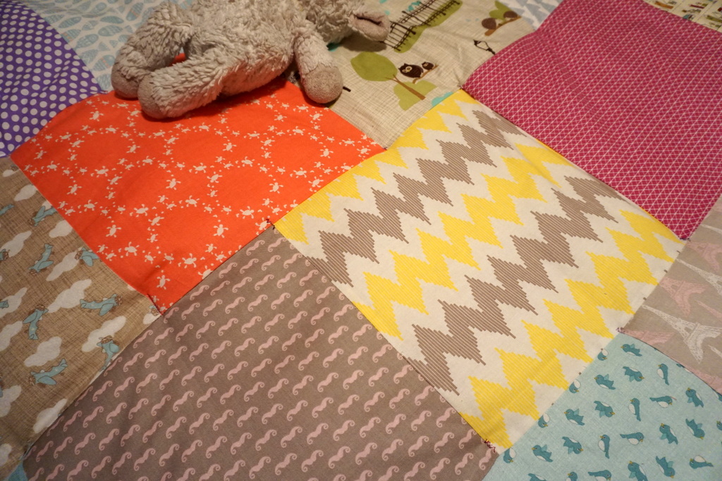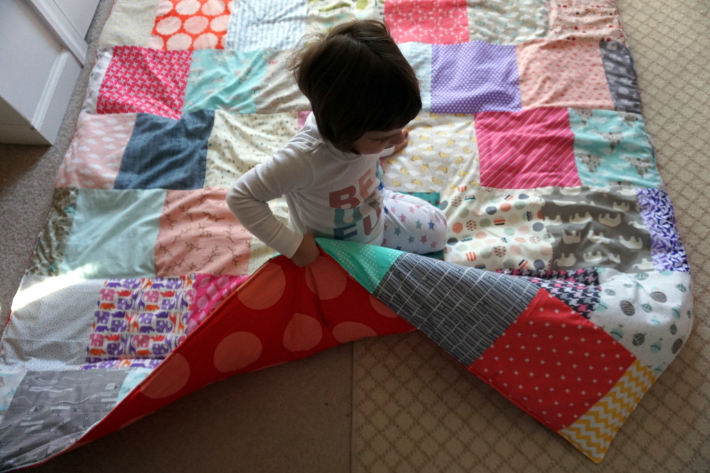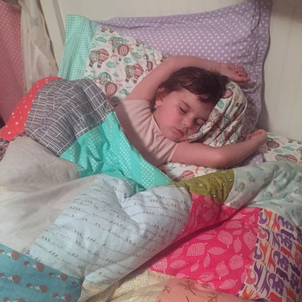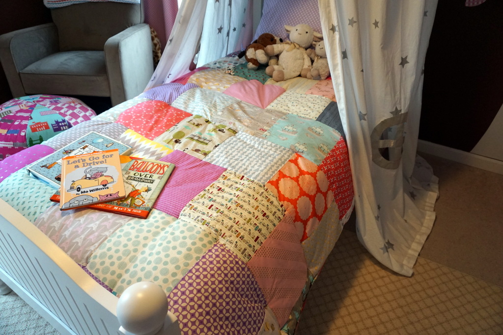 So we ordered a bed from Pottery Barn Kids, and I took her shopping for sheets. I’d planned on buying her a comforter since we needed bedding ASAP, and I figured I’d make her a regular quilt for the spring. Or maybe even for Christmas. But she refused every comforter we looked at, and finally in Target I asked her why she didn’t want Mommy to buy her a blanket. She said, “Mommy make blanket.” And my heart grew three sizes that day!