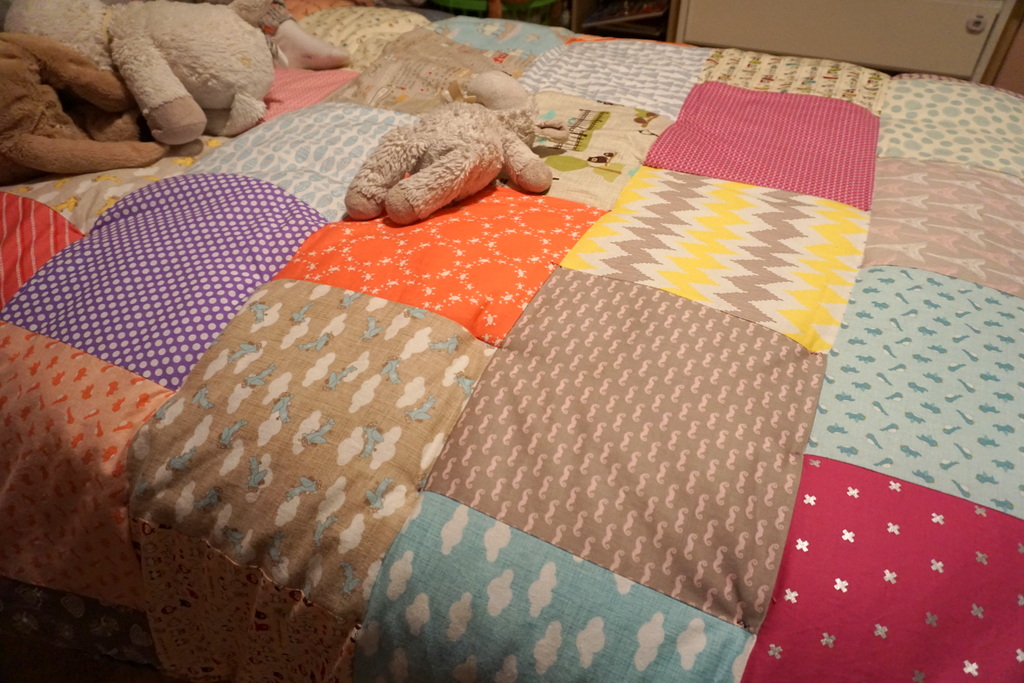 Then I thought I could get away with quilting maybe half a dozen tacks around it and calling it a day. Tada! A patchwork comforter made in 3 days.
