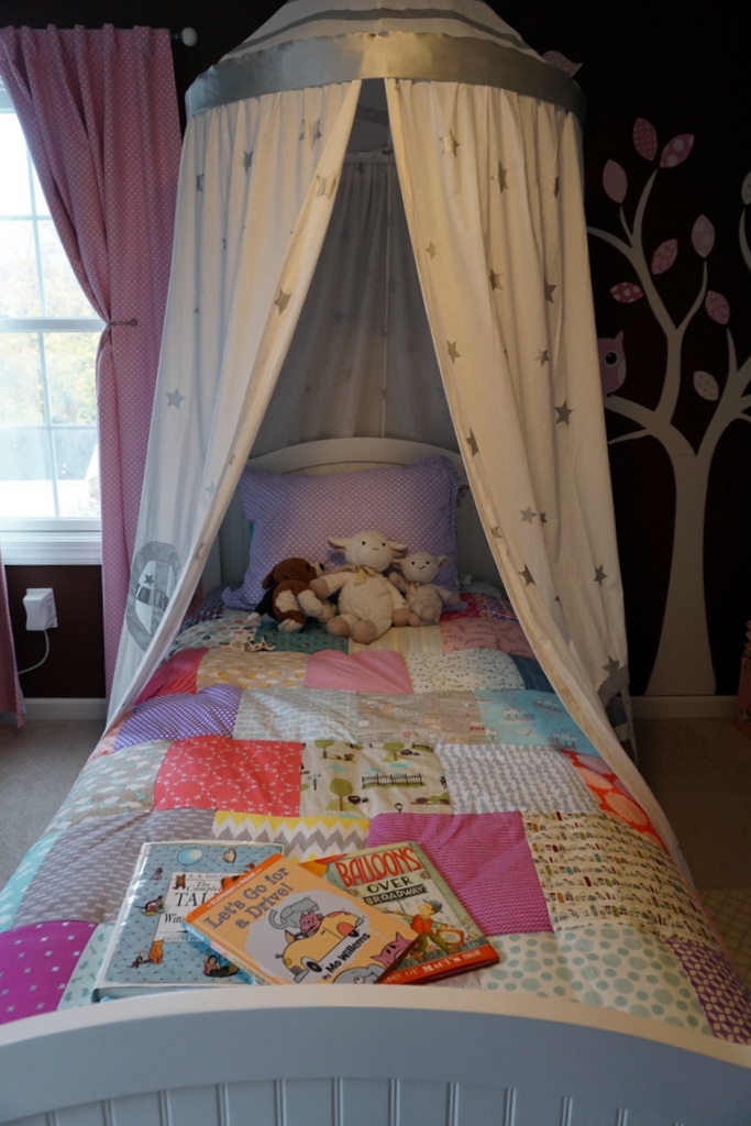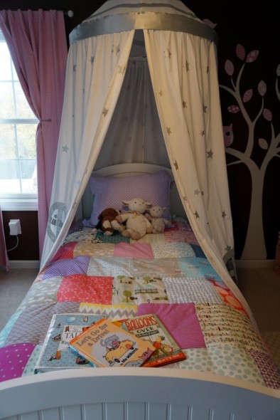 But then we set up her new bed. And we hung her play tent from downstairs over it as a canopy. It’s only been a couple of weeks, but already it looks right at home. She looks right at home, like this is always how the room was supposed to look. She wants to be in that bed all the time. And frankly, so do Adam and I. It is the coziest spot in the house right now.