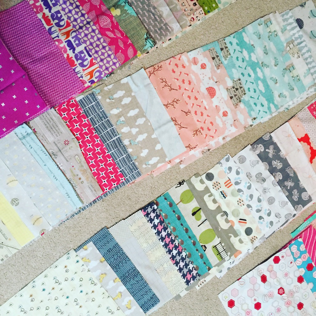 This means that very evening I gathered up and cut all the fabrics I’d need. 68 prints in total, without a single repeat (my stash knows no boundaries). All cut into 10″ squares. A riot of colors, with plenty of purple sprinkled in because it is her favorite. But I didn’t go all purple, that’s a lot of look.