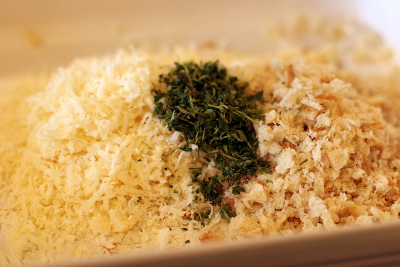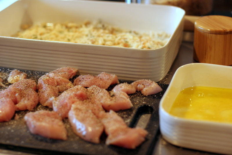 Preheat the oven to 250°F. Season the chicken strips with salt and pepper. In a large, shallow pan, beat the eggs with the oil. In another shallow pan, combine the bread crumbs, cheese and thyme.