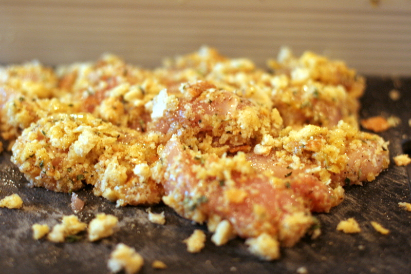 Then put the chicken on a parchment-lined rimmed sheet pan while you dredge the remaining batches. (Next time I would definitely coat mine even more).
