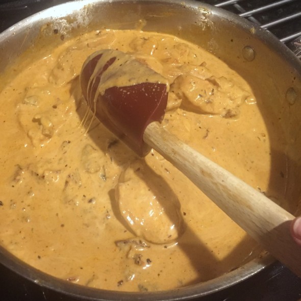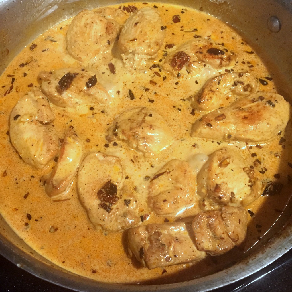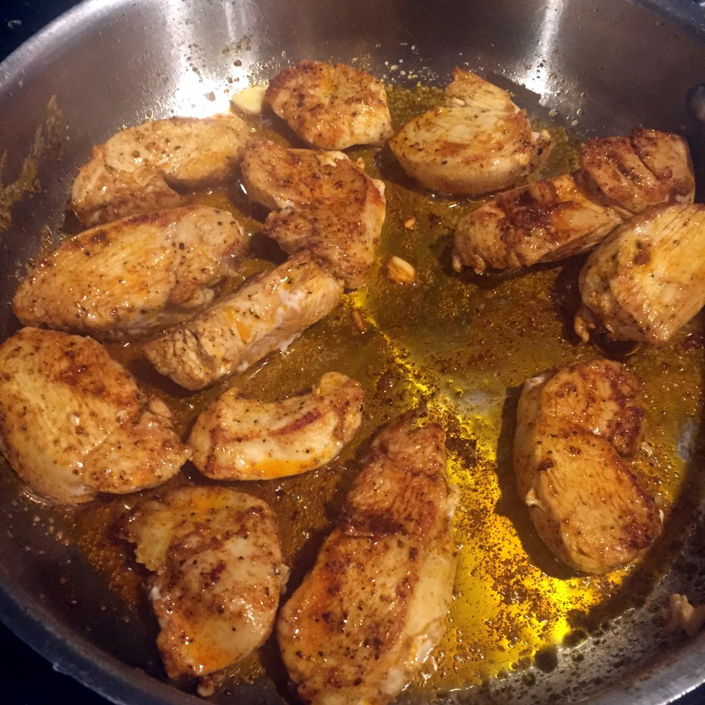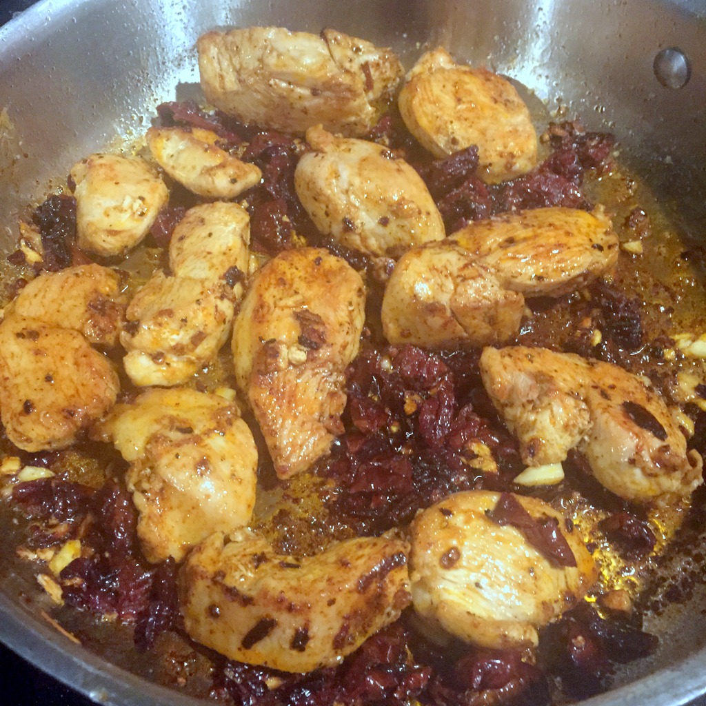 Remove sun-dried tomatoes from the pan, leaving the oil, and add chicken tenders, salted and lightly covered in paprika (for color) and cook on high heat for 1 minute on each side. Remove from heat.