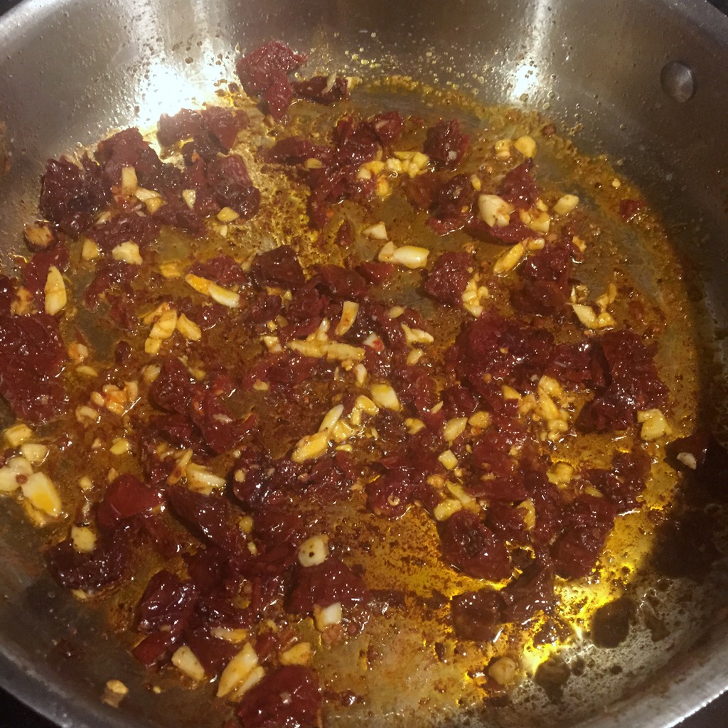 Slice up the sun-dried tomatoes. In a large pan, on high heat, sauté garlic and sun-dried tomatoes in 2 tablespoons of the oil from the sun-dried tomatoes jar, for 1 minute until garlic is fragrant.