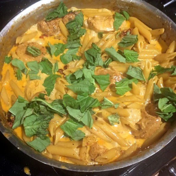 Add cooked pasta to the skillet with the creamy sauce, and stir to combine. Add 1 tablespoon of basil, and at least 1/4 teaspoon of red pepper flakes. Stir to combine.