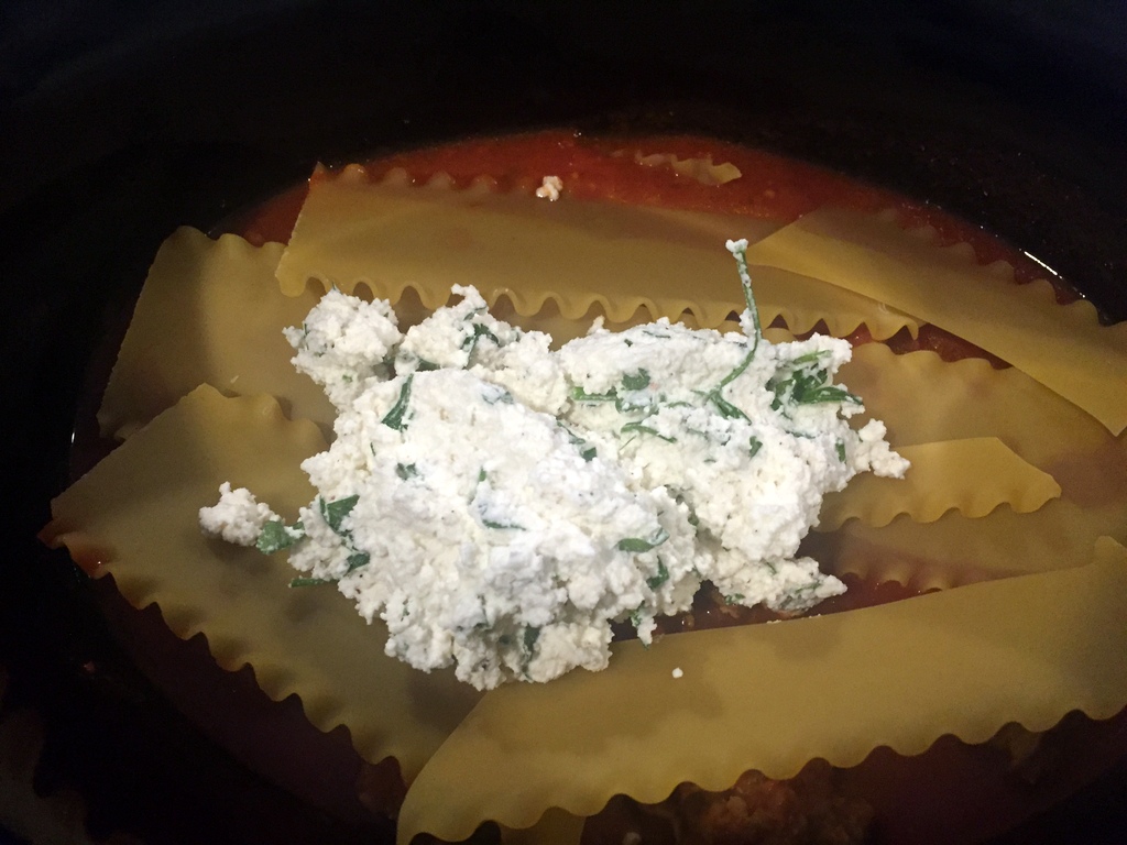 Spread a thin layer of the sauce on the bottom of the slow-cooker insert. Cover the sauce with a single layer of uncooked lasagna noodles (about 3-4), breaking the noodles as needed to fit. Spread about 1/3 cup of the ricotta mixture over the noodles.