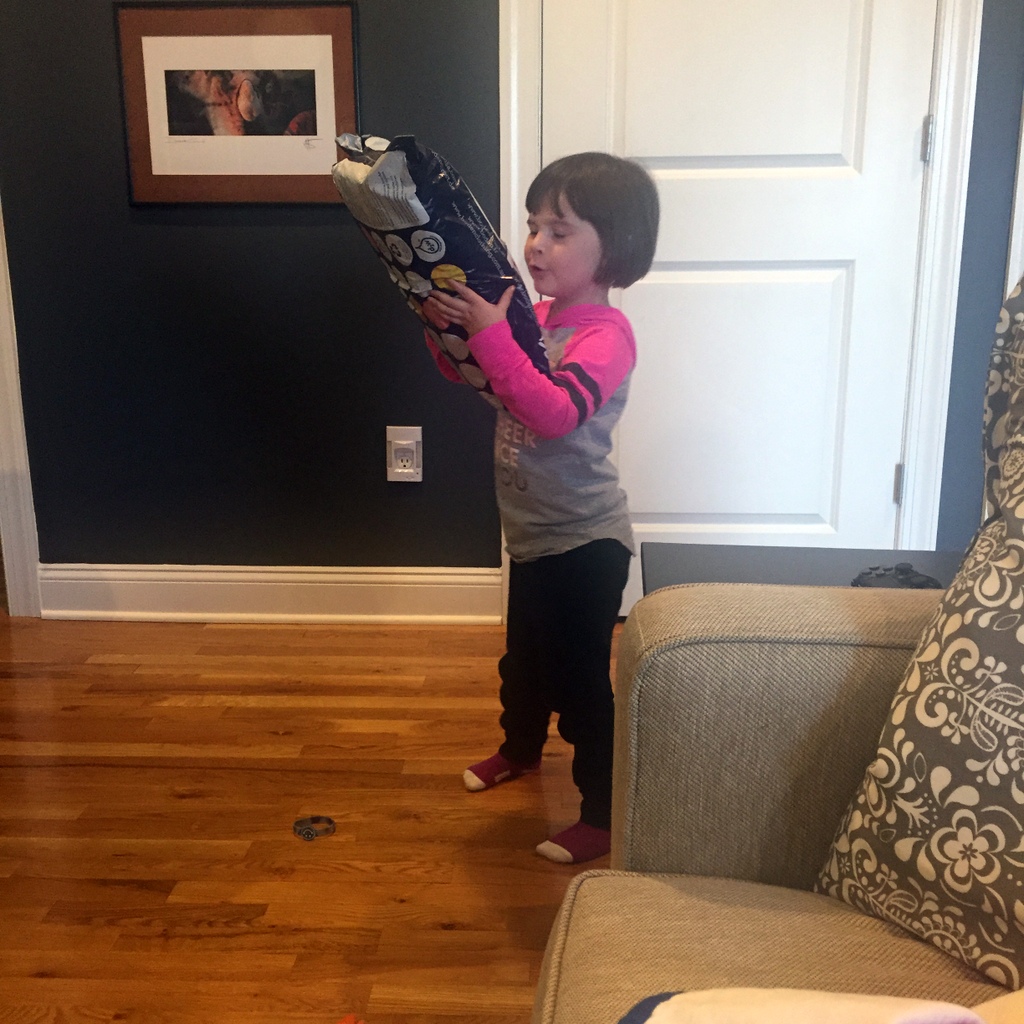 Her superhero-themed party was a hit, and so were the favors. I don’t have many pics without all the other kids in them, so here’s a little video of her playing before everyone arrived.