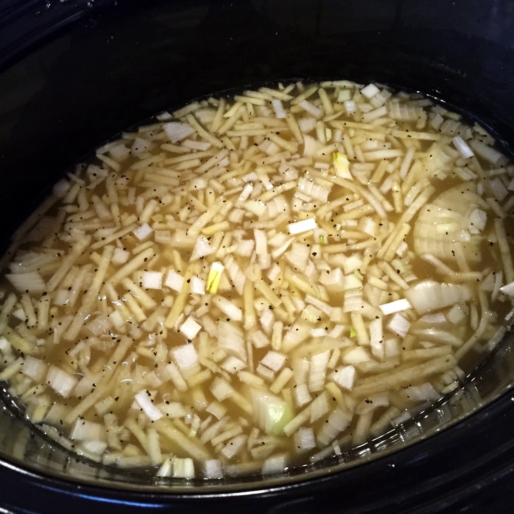 Add broth, water, onion, salt, pepper and potatoes to slow cooker.