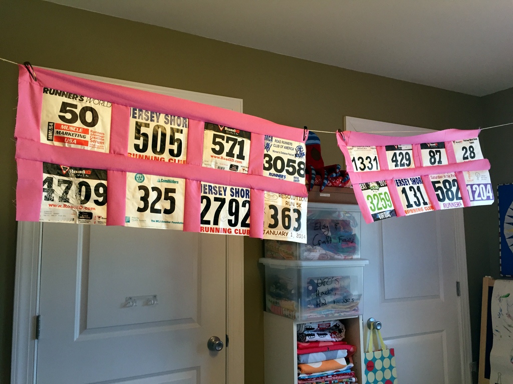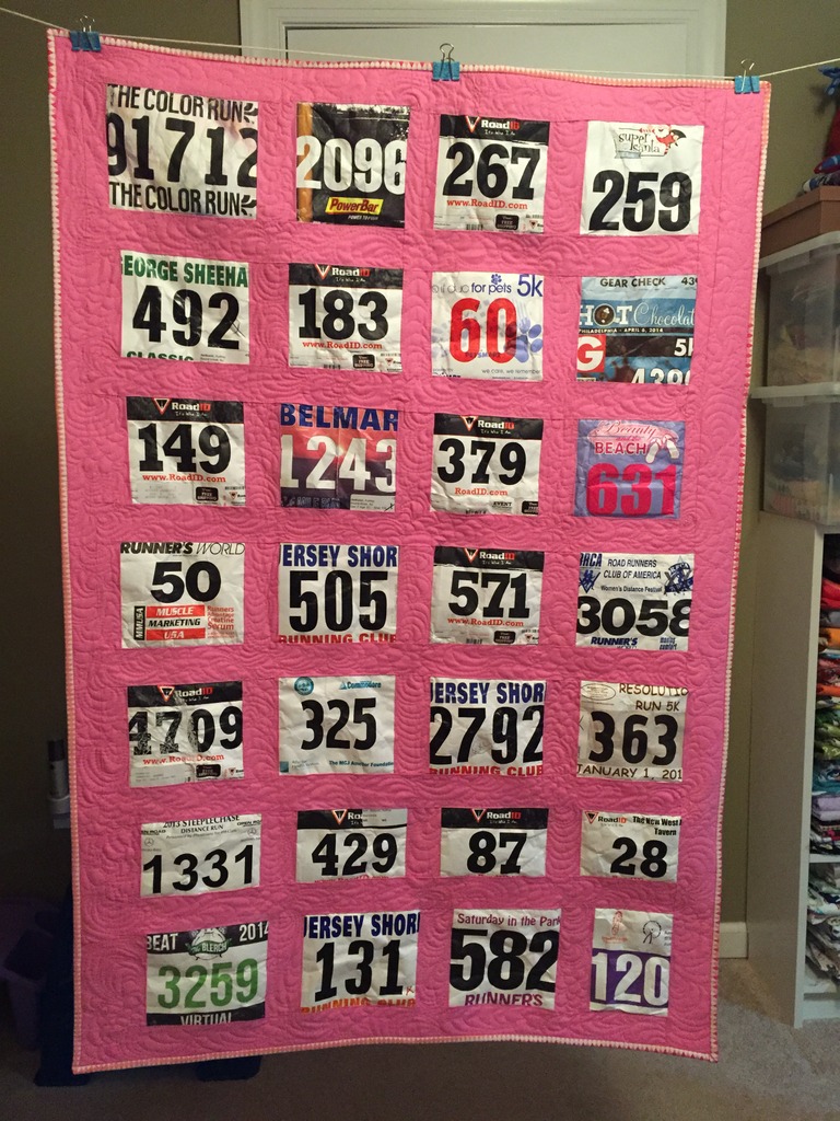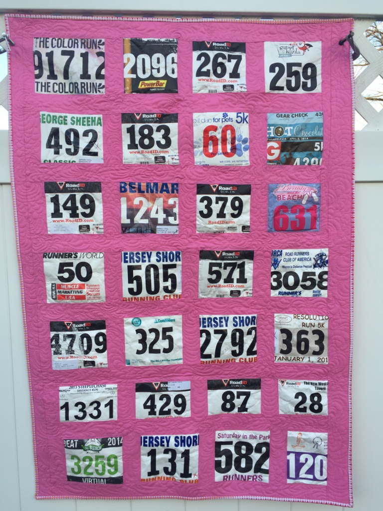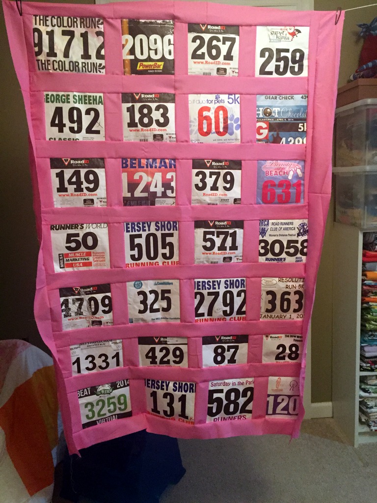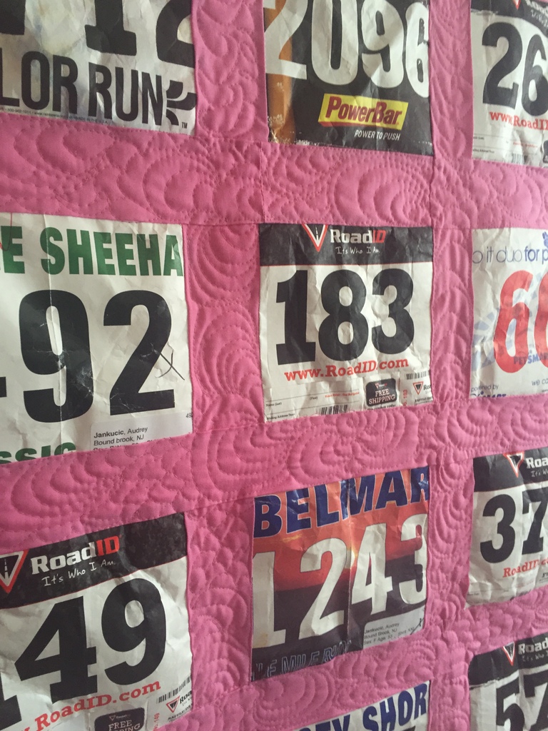 So this is the custom project I was working on for a friend. Audrey is a sorority sister I met…wow, about 12 or 13 years ago? And we’ve been part of several alumnae chapters together. She did all of these 5ks a few years ago, but the race bibs have just been hanging around. So, she asked me to put them together with some pink fabric (pink is one of our sorority colors).