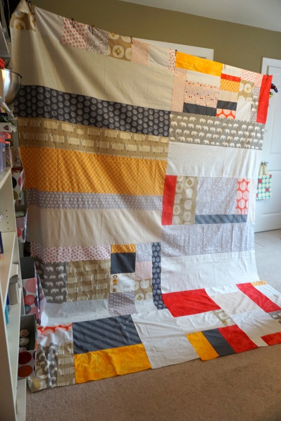 I used every last scrap of fabric I had left in the prints from this quilt top to piece together this backing. And then some. It is going to be a rather sizable addition to our living room. This was completely improvised, and I like how it came out. Not too bad at all.