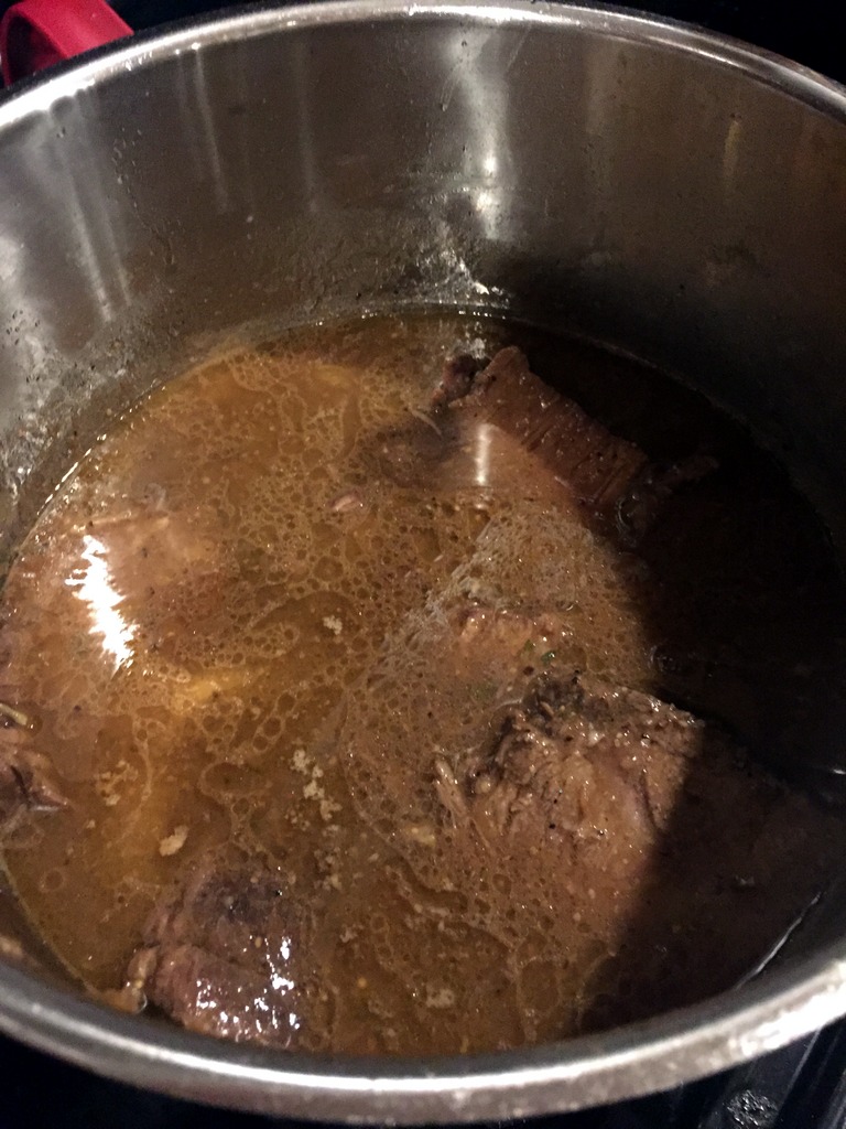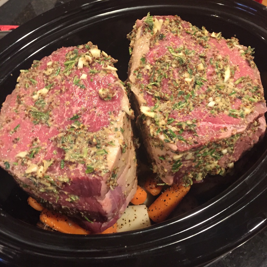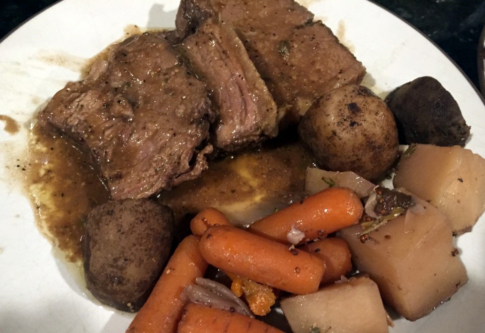 I made this pot roast back when the weather was cold and we needed a hearty meal. And, I had no time to be in the kitchen. The original recipe is the Melt-in-Your-Mouth Pot Roast from Taste of Home, but I ended up substituting dried rosemary and thyme for fresh, and garlic for garlic salt. I also used whole grain mustard because I just love that stuff. And I love any meal that I can throw in a big pot and ignore for a few hours.