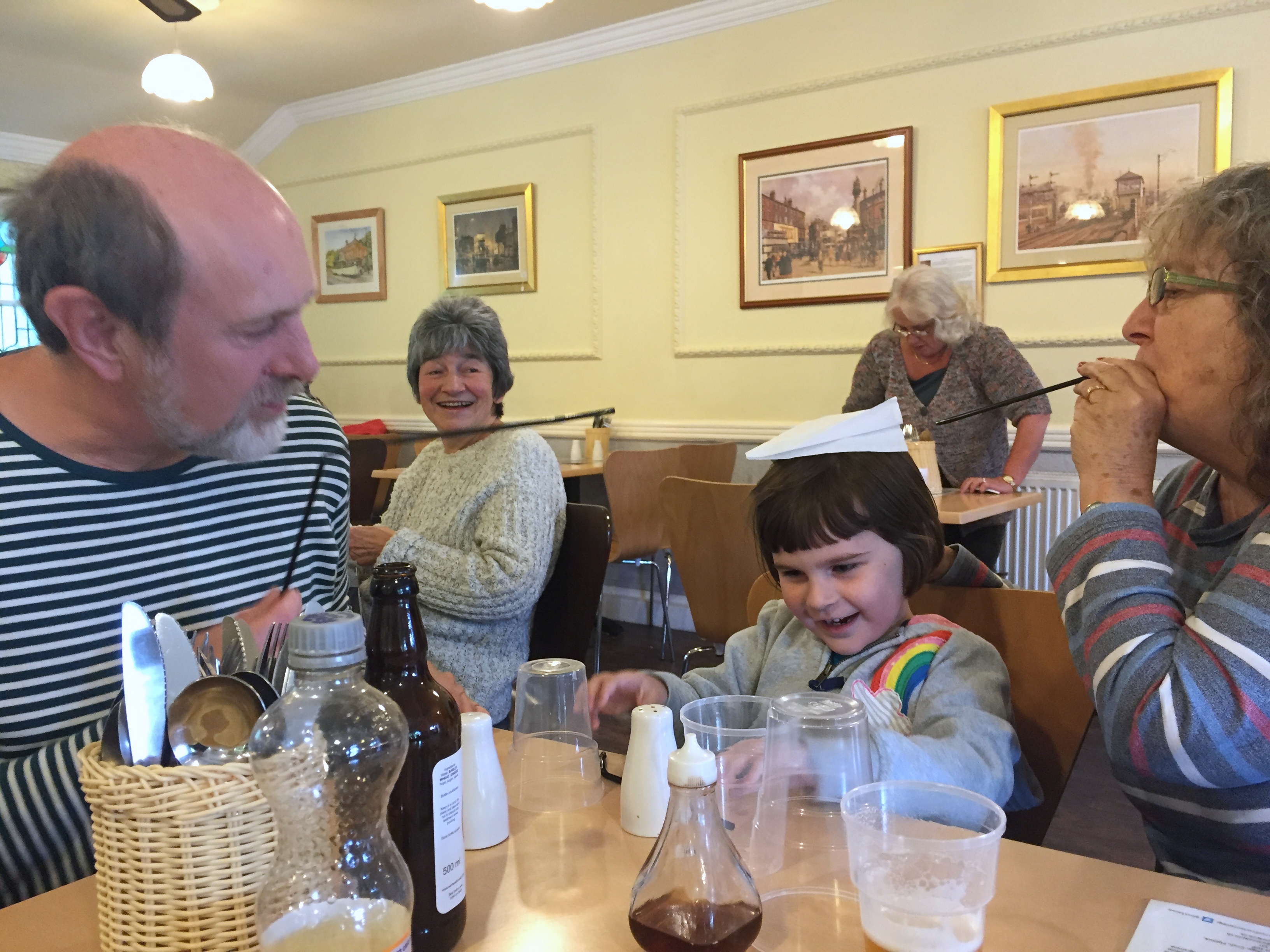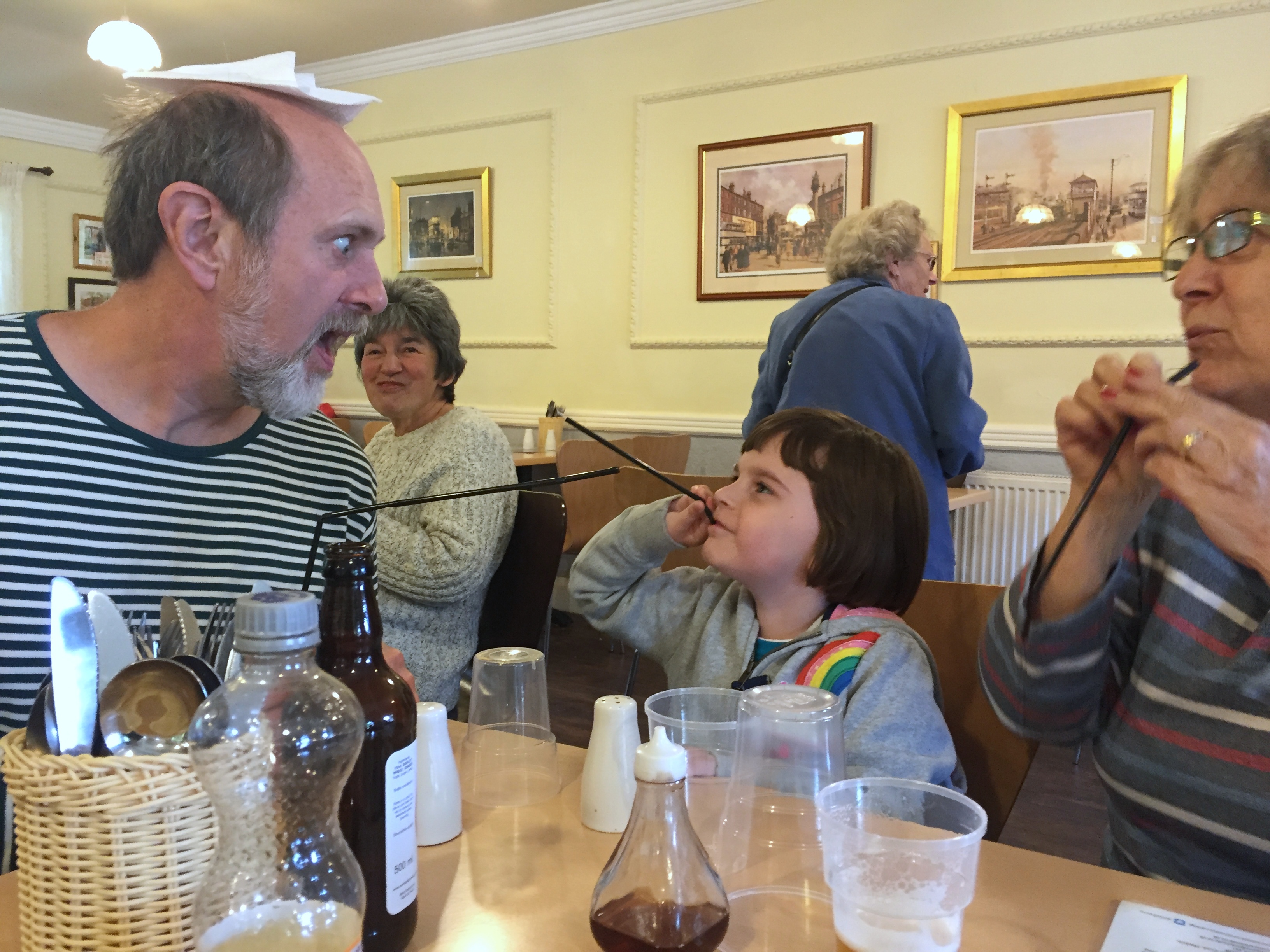 We had lunch in the cafe next door, and H goofed off with her grandparents, some straws, and napkin airplanes.