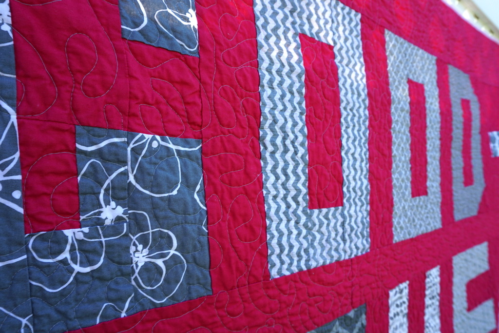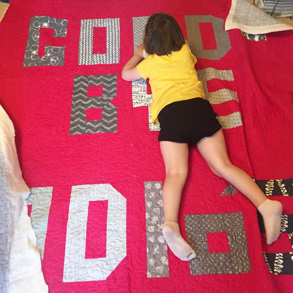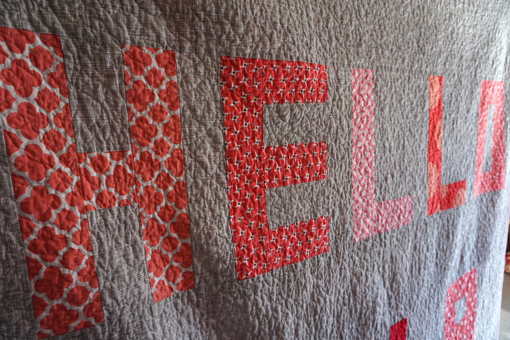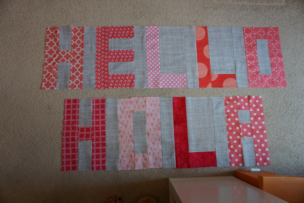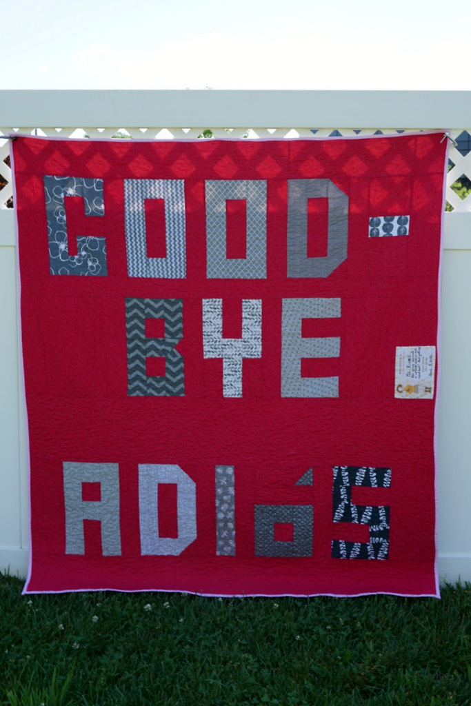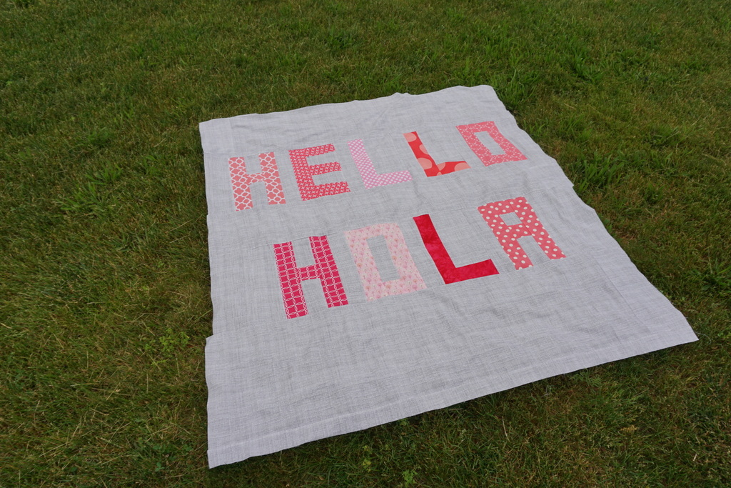 So when all of my printed fabric attempts failed, Adam suggested I just make a quilt out of that shirt. A big “Hello” on front, and a big “Good-Bye” on the back. And that was a genius idea, so that’s exactly what I did. Her teacher is from Colombia, and she taught the kids in both Spanish and English. So, the additional Spanish words seemed perfect to add.